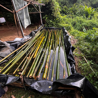 After soaking, the bamboo will dry slowly in the shade for two months, hardening and stabilising, ready to become the roof that will shelter our earth walls during the November workshops.